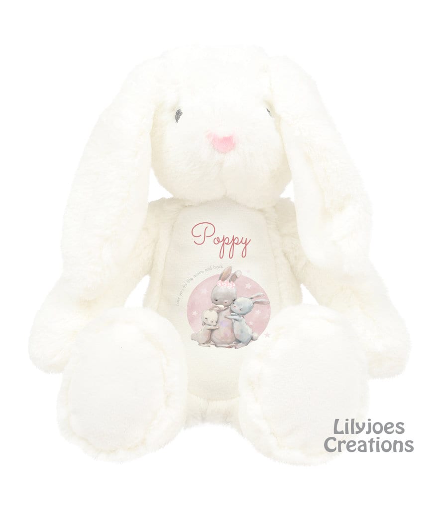 Bunny is available in white, grey, pink or blue, approximately 30cm.